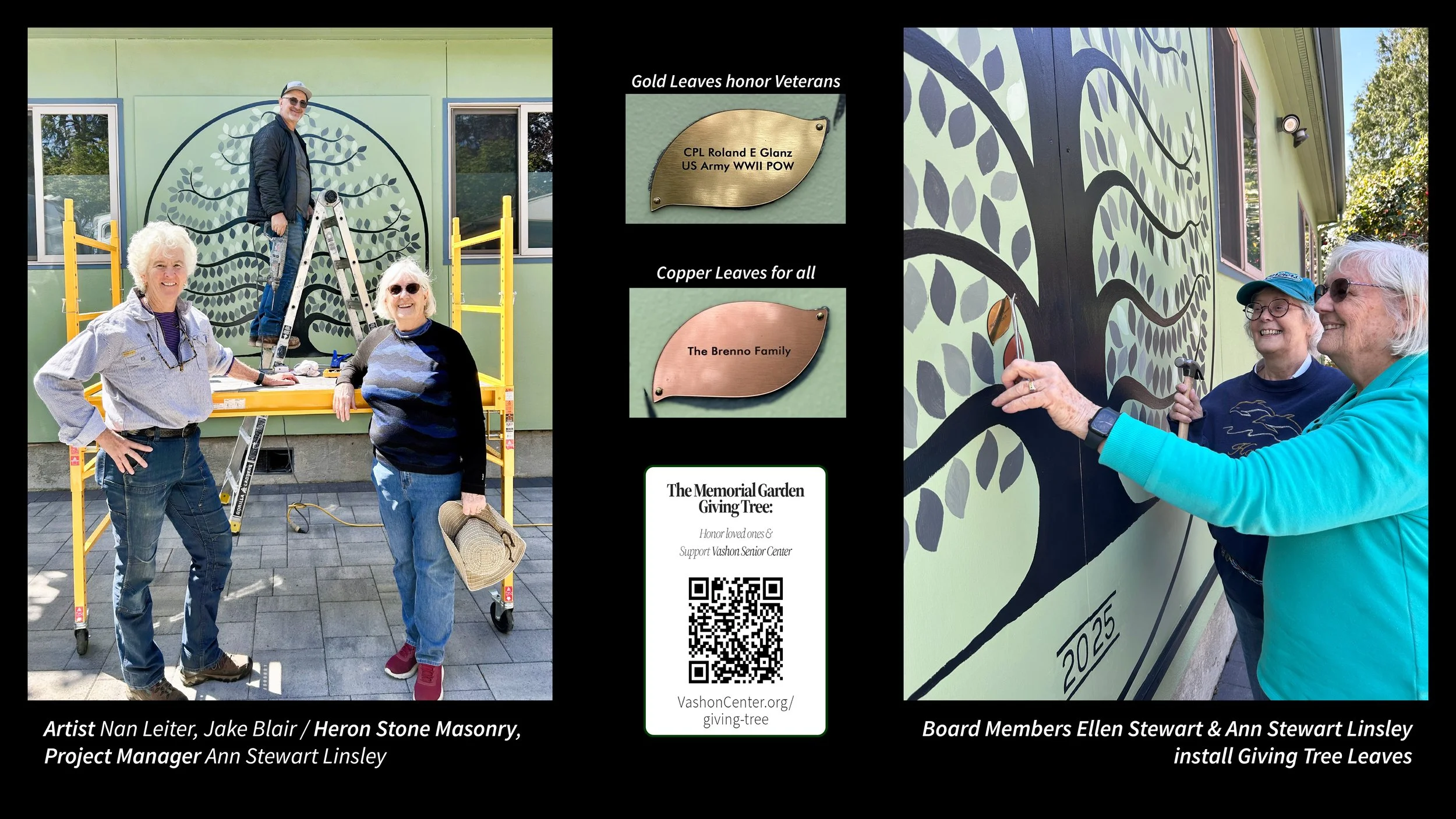 Leaves are available for a donation of $200 each and will be installed on the Giving Tree Mural created by artist Nan Leiter in the newly restored Memorial Garden at the Vashon Senior Center.